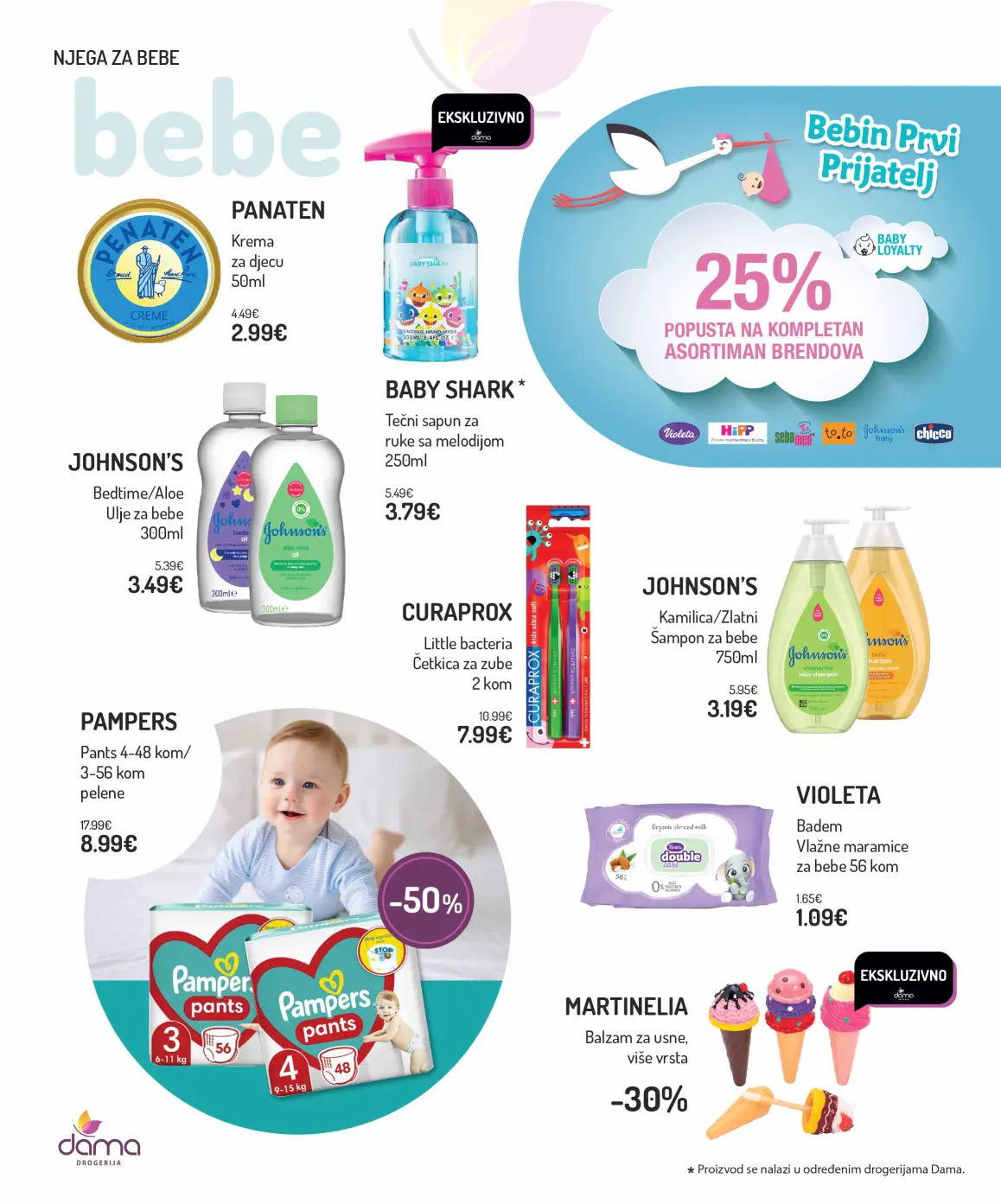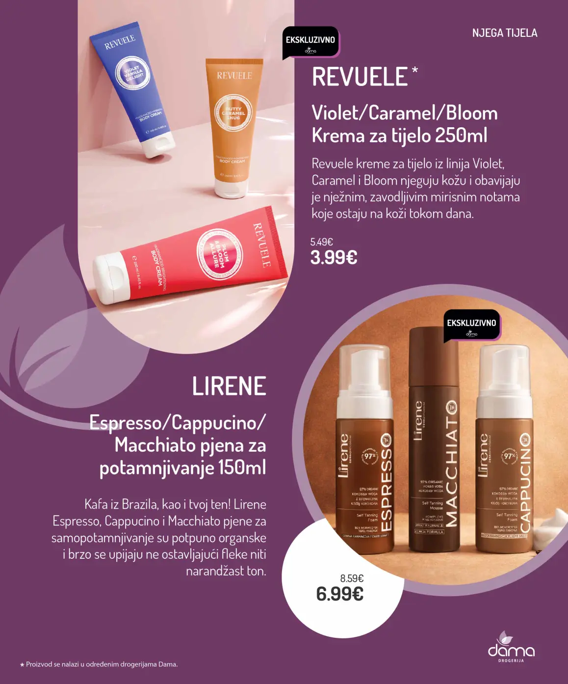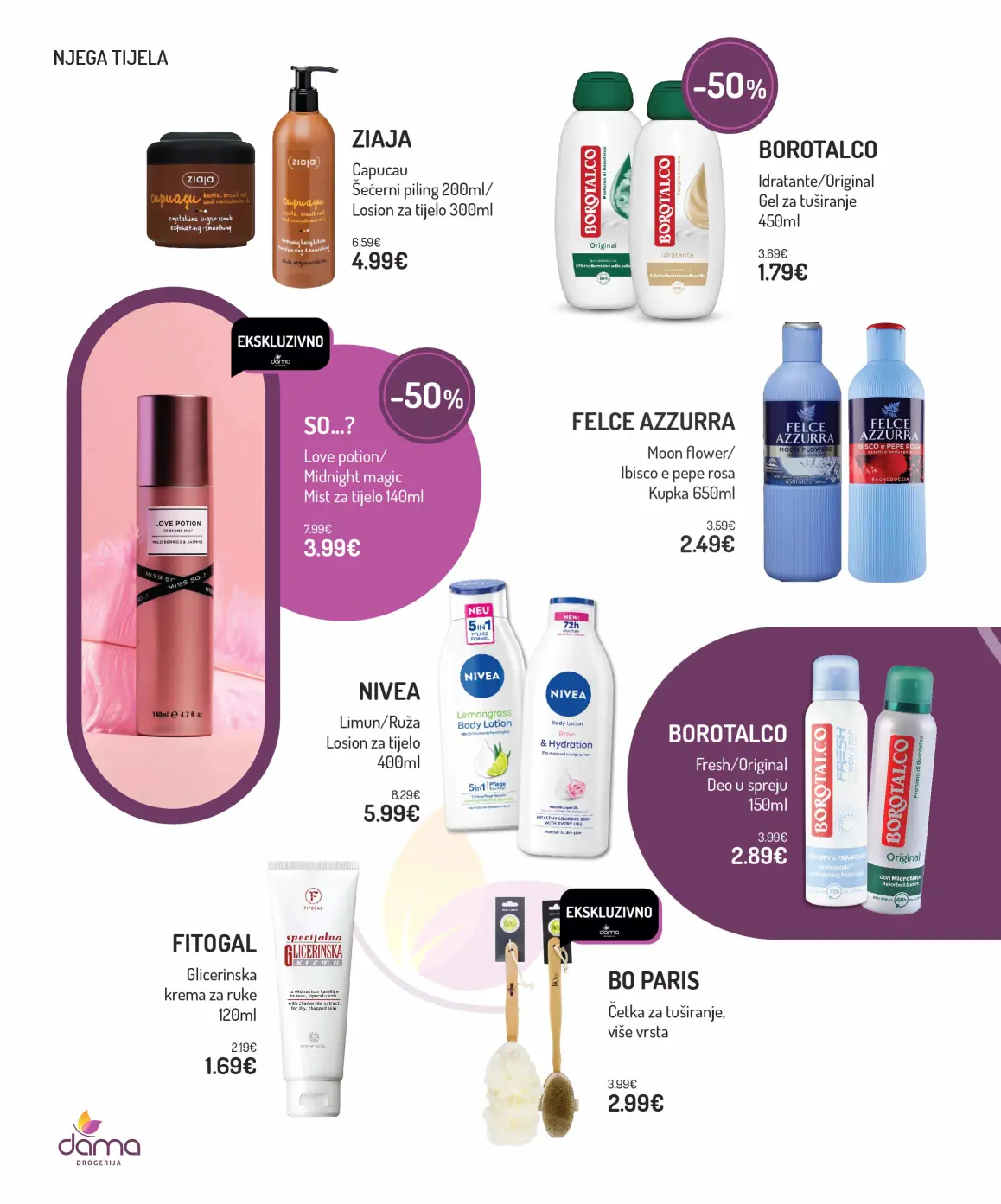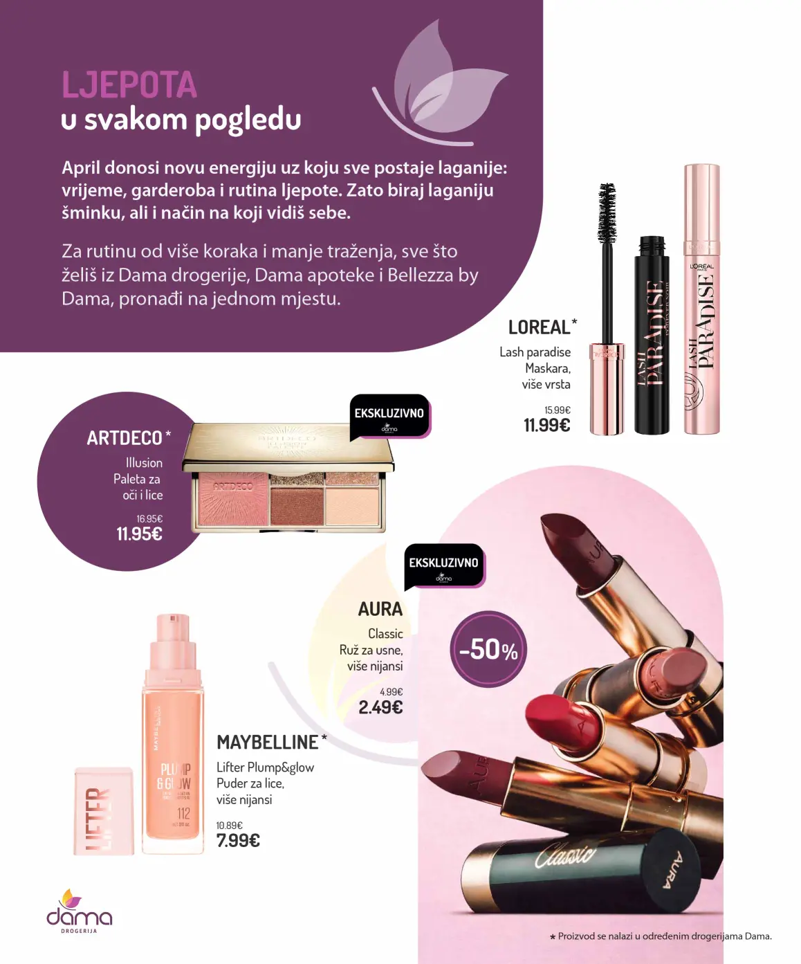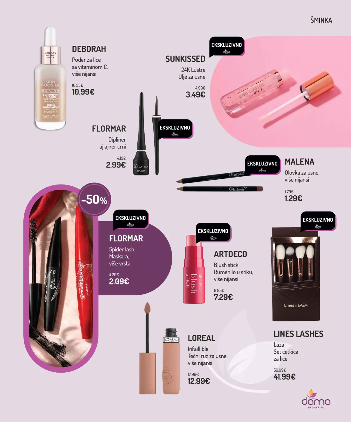 Katalog Dama drogerije donosi bogatu ponudu proizvoda za njegu i ljepotu, kao i za održavanje domaćinstva. U njemu se mogu pronaći najnoviji artikli iz svijeta kozmetike, parfema i lične higijene, što ga čini nezaobilaznim mjestom za sve one koji žele da prate trendove i brinu o sebi na pravi način. Posebna pažnja posvećena je izboru kvalitetnih i provjerenih brendova, zahvaljujući čemu kupci uvijek mogu računati na pouzdane proizvode.